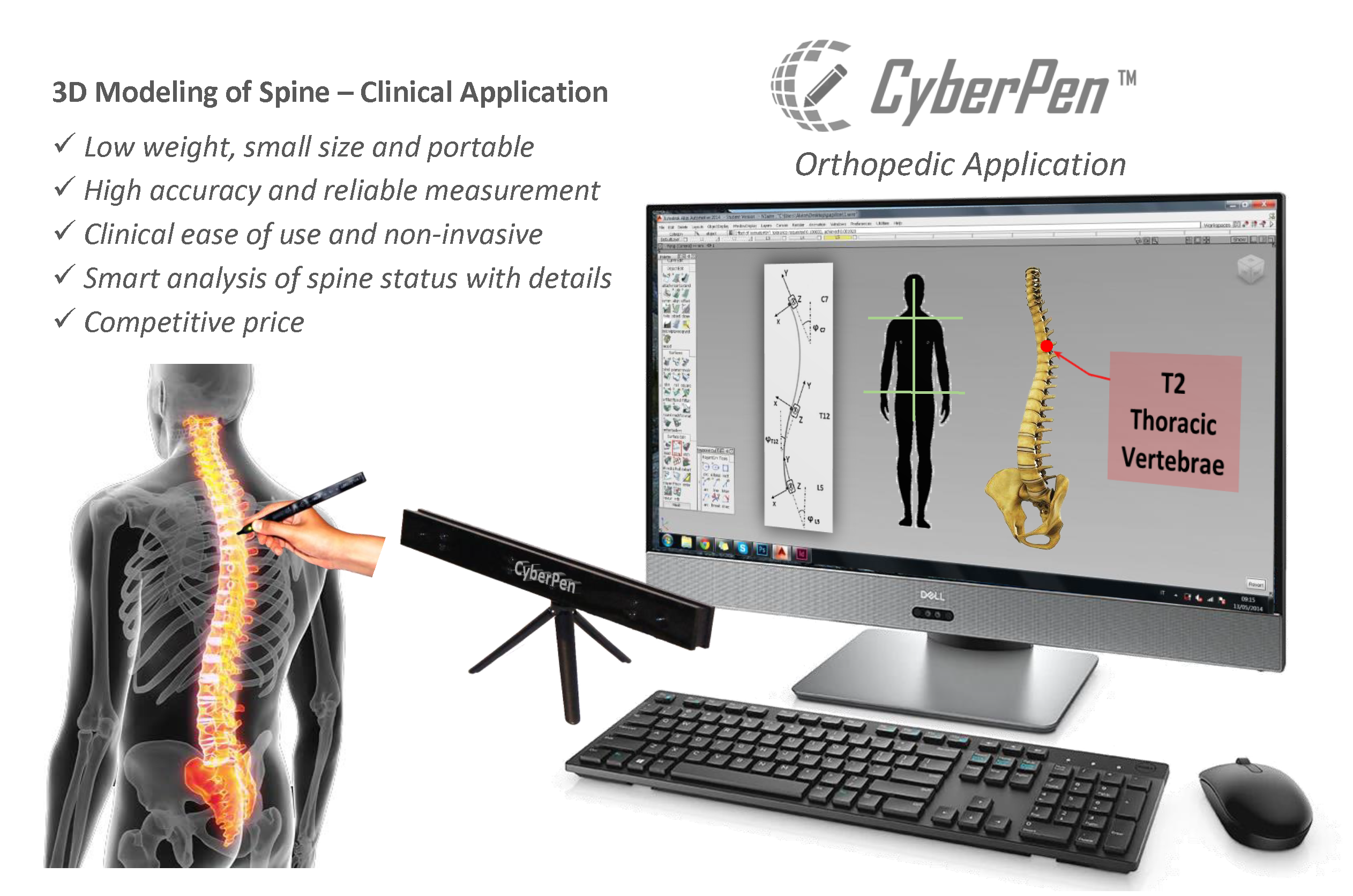 As a clinical instrument, CyberPen is optimized and commercialized to capture 3D model of human spine and pathological analyze the spine posture in comparison with right anatomy. The AI based accurate analysis on the 3D data of spine status is presented by the system to assist orthopedic physician in diagnosis. The corresponding application software shows 3D model and key points of analyzed data relating to the spine posture. Medical application of CyberPen for modelling human spine can improve the posture status of standing, sitting and using smart phone, tablet or PC and recover the wrong habits.