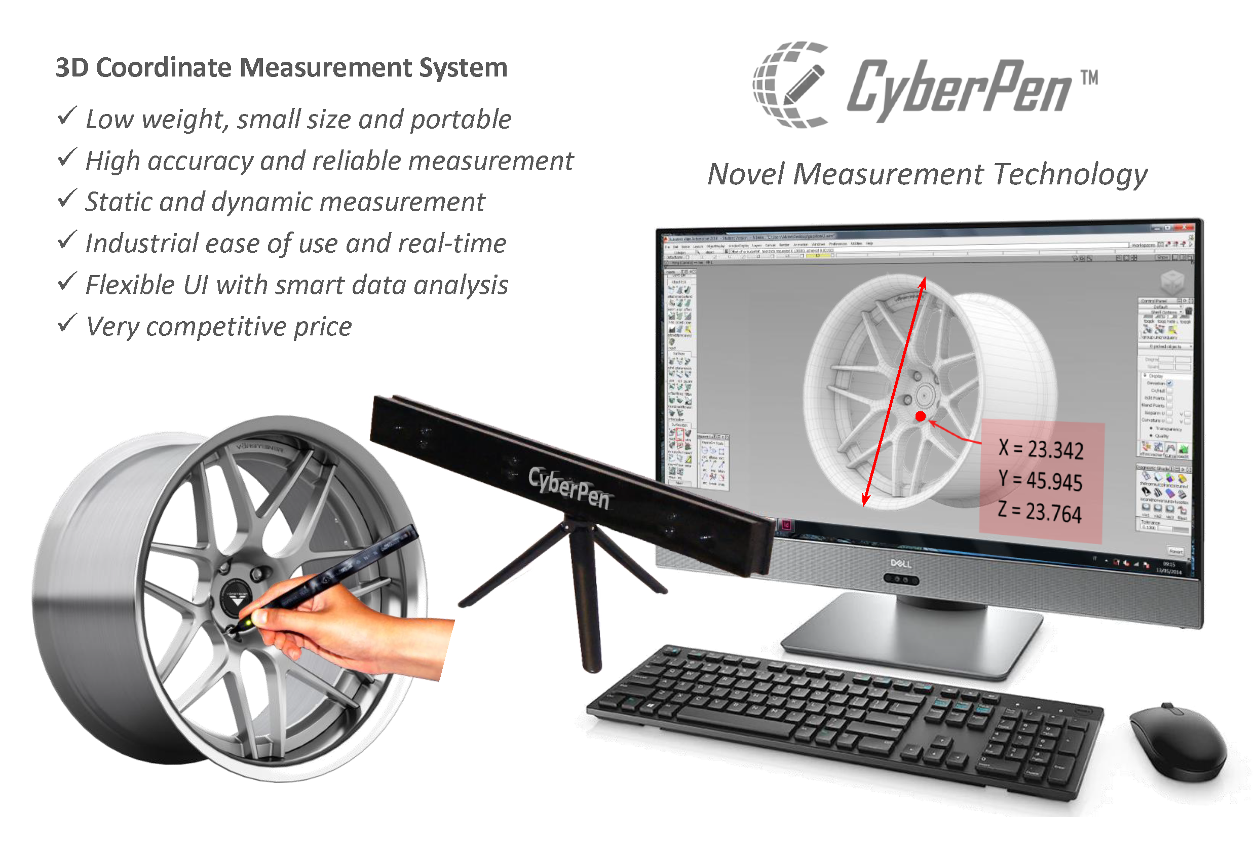 As a measurement device for 3D coordinates, CyberPen is commercialized and optimized for 3D measurement and modeling of industrial products. CyberPen can be used for quality control by AI based inspection of the 3D coordinates, dimensions, distances and angles of the produced parts. All of the deformations and mismatches are determined and reported in real-time for comparing with the standard model of the desired product.
